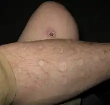 Cigarette burns are usually deliberate injuries caused by pressing a lit cigarette to the skin. They are a common form of child abuse,[1][2][3] self-harm, and torture.[4][5][6][7][8][9][10] They are typically round and about 1 centimetre (0.4 in) in diameter, with a hypopigmented center and hyperpigmented periphery.[4]