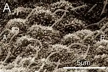 ![]() SEM micrograph of motile cilia projecting from respiratory epithelium in the trachea | |