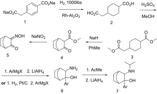 An intramolecular Dieckmann cyclization on methyl 4-(2-methoxy-2-oxoethyl)cyclohexanecarboxylate [1401222-79-4] (3) with sodium hydride base gives reaction Methyl 3-oxobicyclo[2.2.2]octane-2-carboxylate [30144-30-0] (4). Treatment with sodium nitrite introduces a isonitroso group adjacent to the ketone, giving 3-Hydroxyiminobicyclo[2.2.2]octan-2-one, CID:131066320 (5). Addition of the aryl Grignard reagent, and reduction of the oxime gives CID:154108204 (6). A reductive amination of the primary amino group with acetone then completed the synthesis of cilobamine (7).