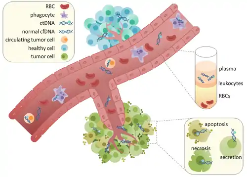ctDNA originates directly from the tumor or from circulating tumor cells (CTCs),[3] which describes viable, intact tumor cells that shed from primary tumors and enter the bloodstream or lymphatic system. The precise mechanism of ctDNA release is unclear. The biological processes postulated to be involved in ctDNA release include apoptosis and necrosis from dying cells, or active release from viable tumor cells.[4][5][6][7][8] Studies in both human (healthy and cancer patients)[9] and xenografted mice[10] show that the size of fragmented cfDNA is predominantly 166bp long, which corresponds to the length of DNA wrapped around a nucleosome plus a linker. Fragmentation of this length might be indicative of apoptotic DNA fragmentation, suggesting that apoptosis may be the primary method of ctDNA release. The fragmentation of cfDNA is altered in the plasma of cancer patients.[11][12] In healthy tissue, infiltrating phagocytes are responsible for clearance of apoptotic or necrotic cellular debris, which includes cfDNA.[13] ctDNA in healthy patients is only present at low levels but higher levels of ctDNA in cancer patients can be detected with increasing tumor sizes.[14] This possibly occurs due to inefficient immune cell infiltration to tumor sites, which reduces effective clearance of ctDNA from the bloodstream.[13] Comparison of mutations in ctDNA and DNA extracted from primary tumors of the same patients revealed the presence of identical cancer-relevant genetic changes. [15][16] This led to the possibility of using ctDNA for earlier cancer detection and treatment follow up. [17]