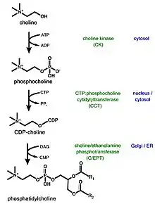 - The Kennedy pathway, which includes the transformation of choline to citicoline, by way of phosphorylcholine, produces phosphatidylcholine when condensed with diacylglycerol.