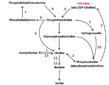 Citicoline is available as a supplement in over 70 countries under a variety of brand names: Cebroton, Ceraxon, Cidilin, Citifar, Cognizin, Difosfocin, Hipercol, NeurAxon, Nicholin, Sinkron, Somazina, Synapsine, Startonyl, Trausan, Xerenoos, etc.[1] When taken as a supplement, citicoline is hydrolyzed into choline and cytidine in the intestine.[2] Once these cross the blood–brain barrier it is reformed into citicoline by the rate-limiting enzyme in phosphatidylcholine synthesis, CTP-phosphocholine cytidylyltransferase.[3][4]