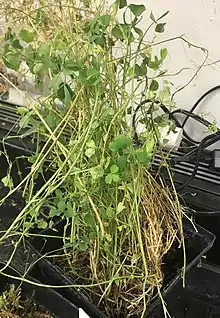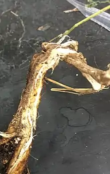 Plants like alfalfa are often mowed, and this causes cut stems. The cut stems increase disease susceptibility be providing wounds for the bacteria to enter.[2] C. insidiosus causes a systemic disease: the leaflets curl up, an indicative symptom of this disease.[1] Occasionally, it causes necrosis of the leaflets.[2] Yellowing of the plant and yellow-brown roots often occurs. This disease is either fatal or causes severe damage to the host with the bacteria leading to stunted growth.[2] C. insidiosus needs to be cultured from the infected plant tissues and PCR-tests must be run to confirm a diagnosis.[2]