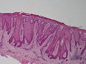 Clear cell acanthoma (also known as Acanthome cellules claires of Degos and Civatte, Degos acanthoma, and Pale cell acanthoma) is a benign clinical and histological lesion initially described as neoplastic, which some authors now regard as a reactive dermatosis. It usually presents as a moist solitary firm, brown-red, well-circumscribed, 5 mm to 2 cm nodule or plaque on the lower extremities of middle-aged to elderly individuals. The lesion has a crusted, scaly peripheral collarette and vascular puncta on the surface. It is characterized by slow growth, and may persist for years. The clinical differential diagnosis includes: dermatofibroma, inflamed seborrheic keratosis, pyogenic granuloma, basal-cell carcinoma, squamous cell carcinoma, verruca vulgaris, psoriatic plaque, and melanoma.