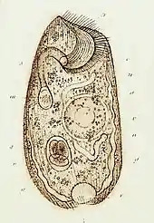 The body is somewhat flexible but non-contractile, roughly ovoid or harp-shaped, and flattened from back to front. It has a large posterior contractile vacuole, and a characteristic posterior indentation (more pronounced in underfed individuals).[7] The posterior vacuole surrounds the cytoproct (anus), through which food waste is eliminated.[8] The macronucleus of Climacostomum virens is normally long and wormlike (vermiform). Climacostomum gigas is reported to have a compact, ovoid macronucleus.[9]