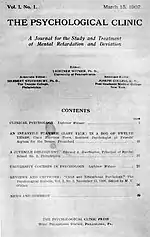 By the second half of the 1800s, the scientific study of psychology was becoming well established in university laboratories. Although there were a few scattered voices calling for applied psychology, the general field looked down upon this idea and insisted on "pure" science as the only respectable practice.[6] This changed when Lightner Witmer (1867–1956), a past student of Wundt and head of the psychology department at the University of Pennsylvania, agreed to treat a young boy who had trouble with spelling. His successful treatment was soon to lead to Witmer's opening of the first psychological clinic at Penn in 1896, dedicated to helping children with learning disabilities.[8] Ten years later in 1907, Witmer was to found the first journal of this new field, The Psychological Clinic, where he coined the term "clinical psychology", defined as "the study of individuals, by observation or experimentation, with the intention of promoting change".[9] The field was slow to follow Witmer's example, but by 1914, there were 26 similar clinics in the US.[10]