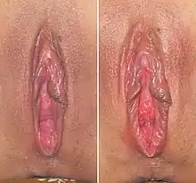 During sexual arousal, arterial blood flow to the clitoris is increased, and within the clitoris, the arteries further branch to supply the erectile tissues. The trabecular smooth muscles of the erectile tissue relax increasing blood flow to fill the vascular spaces, and expanding the erectile tissues until they are fully engorged with blood.[5] The ischiocavernosus and bulbocavernosus muscles contract, compressing the dorsal vein of the clitoris. This compression of the vein restricts drainage of the erectile structures, trapping the blood.[8] This process stretches the tunica albuginea. As a result, the clitoris becomes tumescent to accommodate the increased intracavernosous pressure. The tunica albuginea of the clitoris is made up of one layer making it more elastic than the tunica albuginea of the penis, which is composed of two layers.[9] Erick Janssen (2007) elaborates on this reporting that "the corpora cavernosa of the clitoris are essentially similar to that of the penis except that there is no subalbugineal layer interposed between the tunica albuginea and the erectile tissue. In the penis, this[10] tissue engorges with blood during sexual arousal and becomes compressed against the unyielding tunica, creating penile rigidity – a true erection. The lack of this plexus in the clitoris indicates that while the organ can become tumescent or engorged, it cannot, like the penis, become stiffly erect. The clitoris thus does not become erect with sexual excitement, but engorged."[10] In addition, the tunica albuginea around the glans is thinner than around the shaft in both the clitoris and penis. This gives the glans less firmness relative to the shaft. The extrusion of the glans clitoridis and thinning of the skin enhances sensitivity to physical contact. After a female has orgasmed, the erection usually ends, but this may take time.