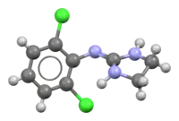 After being ingested, clonidine is absorbed into the blood stream rapidly with an overall bioavailability around 70 - 80%.[1] Peak concentrations in human plasma occur within 60–90 minutes for the "Immediate Release" (IR) version of the drug, which is shorter than the "Extended Release" (ER/XR) version.[82] Clonidine is fairly lipid soluble with the logarithm of its partition coefficient (log P) equal to 1.6;[83][82] to compare, the optimal log P to allow a drug that is active in the human central nervous system to penetrate the blood brain barrier is 2.0.[84] Less than half of the absorbed portion of an orally administered dose will be metabolized by the liver into inactive metabolites, with roughly the other half being excreted unchanged by the kidneys.[82] About one-fifth of an oral dose will not be absorbed, and is thus excreted in the feces.[82] Work with liver microsomes shows in the liver clonidine is primarily metabolized by CYP2D6 (66%), CYP1A2 (10-20%), and CYP3A (0-20%) with negligible contributions from the less abundant enzymes CYP3A5, CYP1A1, and CYP3A4.[5] 4-hydroxyclonidine, the main metabolite of clonidine, is also an alpha-2A agonist but is non lipophilic and is not believed to contribute to the effects of clonidine since it does not cross the blood–brain barrier.[85][86]