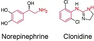 Clonidine, sold under the brand name Catapres among others, is an α2-adrenergic agonist[9] medication used to treat high blood pressure, ADHD, drug withdrawal (alcohol, opioids, or nicotine), menopausal flushing, diarrhea, spasticity, and certain pain conditions.[10] It is used by mouth, by injection, or as a skin patch.[10] Onset of action is typically within an hour with the effects on blood pressure lasting for up to eight hours.[10]