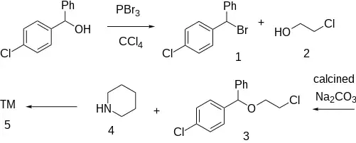 The halogenation of 4-Chlorobenzhydrol [119-56-2] (1) with phosphorus tribromide in tetrachloromethane gives 1-(Bromophenylmethyl)-4-chlorobenzene [948-54-9] (2). Treatment with ethylenechlorohydrin (2-Chloroethanol) [107-07-3] (3) gives 1-(4-Chlorobenzhydryl)oxy-2-chloroethane [5321-46-0] (4). Reaction with piperidine (5) completes the synthesis of Cloperastine (6).