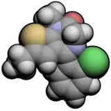 Clotiazepam[2] (marketed under brand name Clozan, Distensan, Trecalmo, Rize, Rizen and Veratran) is a thienodiazepine drug which is a benzodiazepine analog. The clotiazepam molecule differs from benzodiazepines in that the benzene ring has been replaced by a thiophene ring.[3] It possesses anxiolytic,[4] skeletal muscle relaxant,[5] anticonvulsant, sedative properties.[6] Stage 2 NREM sleep is significantly increased by clotiazepam.[7]