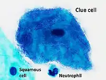 Clue cells are epithelial cells of the vagina that get their distinctive stippled appearance by being covered with bacteria. The etymology behind the term "clue" cell derives from the original research article from Gardner and Dukes describing the characteristic cells. The name was chosen for its brevity in describing the sine qua non of bacterial vaginosis.[1]