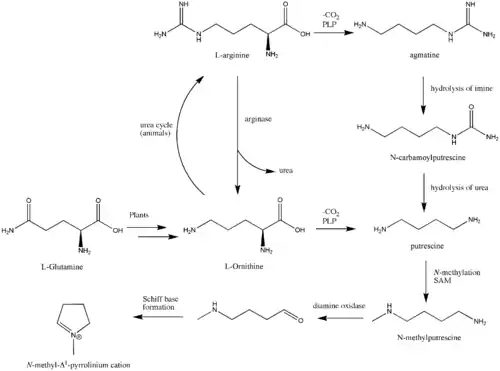 - Boswell HD, Dräger B, McLauchlan WR, Portsteffen A, Robins DJ, Robins RJ, Walton NJ (November 1999). "Specificities of the enzymes of N-alkyltropane biosynthesis in Brugmansia and Datura". Phytochemistry. 52 (5): 871–8. Bibcode:1999PChem..52..871B. doi:10.1016/S0031-9422(99)00293-9. PMID 10626376.