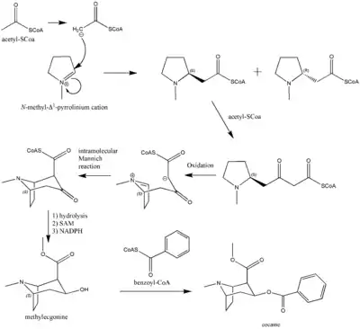 - Leete E, Bjorklund JA, Couladis MM, Kim SH (1991). "Late intermediates in the biosynthesis of cocaine: 4-(1-methyl-2-pyrrolidinyl)-3-oxobutanoate and methyl ecgonine". J. Am. Chem. Soc. 113 (24): 9286–9292. doi:10.1021/ja00024a039.