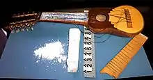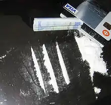 Rolled up banknotes, hollowed-out pens, cut straws, pointed ends of keys, specialized spoons,[53] long fingernails, and (clean) tampon applicators are often used to insufflate cocaine. The cocaine typically is poured onto a flat, hard surface (such as a mobile phone screen, mirror, CD case or book) and divided into "bumps", "lines" or "rails", and then insufflated.[54] A 2001 study reported that the sharing of straws used to "snort" cocaine can spread blood diseases such as hepatitis C.[55]
