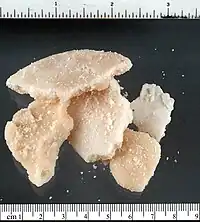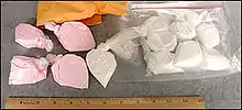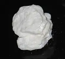 Cocaine is a central nervous system stimulant.[42] Its effects can last from 15 minutes to an hour. The duration of cocaine's effects depends on the amount taken and the route of administration.[43] Cocaine can be in the form of fine white powder, bitter to the taste. Crack cocaine is a smokeable form of cocaine made into small "rocks" by processing cocaine with sodium bicarbonate (baking soda) and water.[12][44] Crack cocaine is referred to as "crack" because of the crackling sounds it makes when heated.[12]