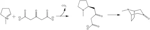- (a) Willstatter R (1903). "Synthese der Ecgoninsäure" [Synthesis of Tropine]. Liebigs Ann. (in German). 326 (1–2): 23. doi:10.1002/jlac.19033260105. (b) Robinson RJ (1917). "LXIII. A synthesis of tropinone". J. Chem. Soc., Trans. 111: 762–768. doi:10.1039/CT9171100762. (c) Schopf C, Lehman G (1935). "Die Synthese des Tropinons, Pseudopelletierins, Lobelanins und verwandter Alkaloide unter physiologischen Bedingungen" [The synthesis of tropinone, pseudopelletierin, lobelanin and related alkaloids under physiological conditions]. Liebigs Ann. (in German). 518: 1–37. doi:10.1002/jlac.19355180102.