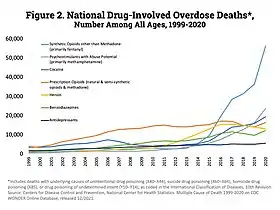 Opioid involvement in cocaine overdose deaths in the US. The pale green line is cocaine without any opioid (bottom line in 2017). The yellow line is cocaine and synthetic opioids other than methadone (top line in 2017).[62]