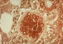 The first case of what was later named coccidioidomycosis was described in 1892 in Buenos Aires by Alejandro Posadas, a medical intern at the Hospital de Clínicas "José de San Martín".[54] Posadas established an infectious character of the disease after being able to transfer it in laboratory conditions to lab animals.[55] In the U.S., Dr. E. Rixford, a physician from a San Francisco hospital, and T. C. Gilchrist, a pathologist at Johns Hopkins Medical School, became early pioneers of clinical studies of the infection.[56] They decided that the causative organism was a Coccidia-type protozoan and named it Coccidioides immitis (resembling Coccidia, not mild).