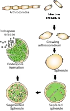 Rain starts the cycle of initial growth of the fungus in the soil.[16] In soil (and in agar media), Coccidioides exist in filament form. It forms hyphae in both horizontal and vertical directions. Over a prolonged dry period, cells within hyphae degenerate to form alternating barrel-shaped cells (arthroconidia) which are light in weight and carried by air currents. This happens when the soil is disturbed, often by clearing trees, construction or farming. As the population grows, so do all these activities, causing a potential cascade effect. The more land that is cleared and the more arid the soil, the riper the environment for Coccidioides.[17] These spores can be easily inhaled unknowingly. On reaching alveoli they enlarge in size to become spherules, and internal septations develop. This division of cells is made possible by the optimal temperature inside the body.[18] Septations develop and form endospores within the spherule. Rupture of spherules release these endospores, which in turn repeat the cycle and spread the infection to adjacent tissues within the body of the infected individual. Nodules can form in lungs surrounding these spherules. When they rupture, they release their contents into bronchi, forming thin-walled cavities. These cavities can cause symptoms including characteristic chest pain, coughing up blood, and persistent cough. In individuals with a weakened immune system, the infection can spread through the blood. The fungus can also, rarely, enter the body through a break in the skin and cause infection.[18]
