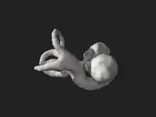 The cochlea is a portion of the inner ear that looks like a snail shell (cochlea is Greek for snail).[4] The cochlea receives sound in the form of vibrations, which cause the stereocilia to move. The stereocilia then convert these vibrations into nerve impulses which are taken up to the brain to be interpreted. Two of the three fluid sections are canals and the third is the 'Organ of Corti' which detects pressure impulses that travel along the auditory nerve to the brain. The two canals are called the vestibular canal and the tympanic canal.