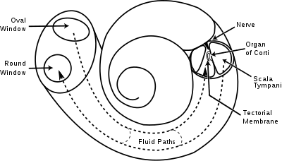 The cochlea is the part of the inner ear involved in hearing. It is a spiral-shaped cavity in the bony labyrinth, in humans making 2.75 turns around its axis, the modiolus.[2][3] A core component of the cochlea is the Organ of Corti, the sensory organ of hearing, which is distributed along the partition separating the fluid chambers in the coiled tapered tube of the cochlea.