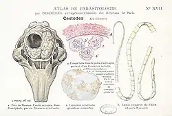 The texts of Hippocrates describe a nervous disease of sheep consistent with the symptoms of gid, comparing its symptoms to epilepsy and describing the accumulation of bad-smelling fluid in the brain.[5][6] However, it was only in the 1600s that clearer behavioural and necropsy descriptions were recorded, including the chacteristic brain cysts and early surgical methods of removal.[7] The cause of these cysts was identified as an animal parasite in 1780 by Nathanael Gottfried Leske and Johann August Ephraim Goeze.[6][7] It was shown that the parasite could be transferred across species to and from dogs by Karl Theodor Ernst von Siebold and Friedrich Küchenmeister in the 1850s and the species was identified as Taenia multiceps (then called Coenurus cerebralis) in 1890.[7]