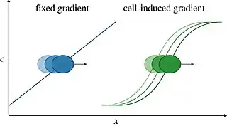 Co-attraction between collectively migrating cells is the process by which cells of the same type secrete chemo-attractant (e.g. C3a in neural crest cells), that stimulates other cells in the group that have the receptors to that chemo-attractant. Cells sense the secreted substrate and respond to the stimulation by moving towards each other's and maintain high cell density.[7][8]