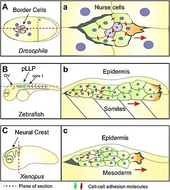 - A: Border cell migration in a Drosophila embryo. (a) shows border cells migrating in a confined space surrounded by gigantic nurse cells.[10]