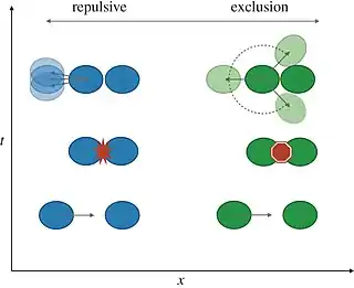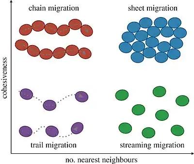 In the diagram immediately below, different morphologies of collective cell migration are characterized by their cohesiveness during migration (inversely related to density), as well as the number of nearest neighbours with which a cell interacts while moving (i.e. the topological arrangement of individual cells in the population). Cells (ellipses) can migrate in linear chains (top left), with persistent contact to cells either side of them, or along trails formed by preceding cells (bottom left). In migrating sheets, cells may maintain most of their nearest neighbours over time (top right), whereas in streaming migration cell–cell contacts occur at longer range and with potentially frequent neighbour rearrangement (bottom right). These concepts easily extend to three-dimensional migration, in which case the place of migrating sheets can be taken by moving clusters or spheroids.[25]