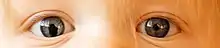 Iris coloboma in the right eye of a 10-month-old child. The pupil cannot contract to a smaller size than pictured, but may still be able to dilate in low light.