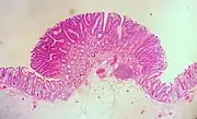 Polyps are either pedunculated (attached to the intestinal wall by a stalk) or sessile (grow directly from the wall).[5][6]:1342 In addition to the gross appearance categorization, they are further divided by their histologic appearance as tubular adenoma which are tubular glands, villous adenoma which are long finger like projections on the surface, and tubulovillous adenoma which has features of both.[6]:1342