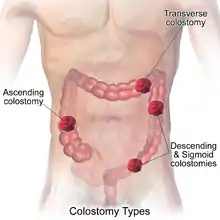 Placement of the stoma on the abdomen can occur at any location along the colon, but the most common placement is on the lower left side near the sigmoid where a majority of colon cancers occur. Other locations include the ascending, transverse, and descending sections of the colon.[4]