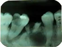 Periapical readiograph of lower right teeth, showing a large carious lesion in the distal of the lower right second molar. The same tooth also has an extensive periodontal defect. At this stage, without further information, it is difficult to tell which process has occurred first and lead to the death of the pulp.