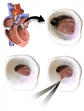 Commissurotomy of cardiac valves is called valvulotomy,[1] and consists of making one or more incisions at the edges of the commissure formed between two or three valves, in order to relieve constriction such as occurs in valvular stenosis, especially mitral valve stenosis.