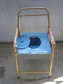 A commode chair, known in British English simply as a commode is a type of chair used by someone who needs help going to the toilet due to illness, injury or disability. A commode chair sometimes has wheels to allow easy transport to the bathroom or shower. Most commode chairs have a removable pail and flip-back armrests.