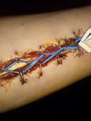 42. Kakagia D, Karadimas EJ, Drosos G, Ververidis A, Trypsiannis G, Verettas D (May 2014). "Wound closure of leg fasciotomy: comparison of vacuum-assisted closure versus shoelace technique. A randomised study". Injury. 45 (5): 890–3. doi:10.1016/j.injury.2012.02.002. PMID 22377275.