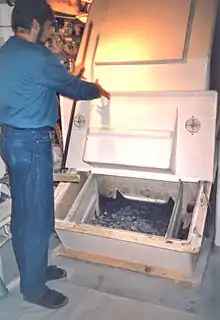 Composting container of "TerraNova" composting toilet, showing open removal chamber (town house at the ecological settlement Hamburg-Allermöhe, Germany)
