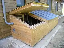 Slow composting toilets have been installed by the Green Mountain Club in Vermont's woodlands. They employ multiple vaults (called cribs) and a movable building. When one of the vaults fills, the building is moved over an empty vault. The full vault is left untouched for as long as possible (up to three years) before it is emptied. The large surface area and exposure to air currents can cause the pile to dry out. To counteract this, signs instruct users to urinate in the toilet.[37] The club also uses pit latrines and simple bucket toilets with woodchips and external composting and directs users to urinate in the forest to prevent odiferous anaerobic conditions.[38]