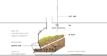 A drainage system removes leachate. Otherwise, excess moisture can cause anaerobic conditions and impede decomposition. Urine diversion can improve compost quality, since urine contains large amounts of ammonia that inhibits microbiological activity.[6]