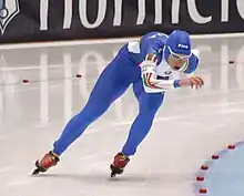 Depending on the material used and the requirements of the sport, compression garments can be designed to keep athletes cool or warm. For example, speedskaters can wear compression bodysuits on the cold rink, while beach volleyball players can wear a similar-looking suit made of a more breathable, lightweight blend. Both use moisture wicking materials like nylon and spandex in order to keep the garment lightweight. Additionally, speed skaters can use the aerodynamic nature of wearing a skintight suit to their advantage, while a beach volleyball player has the added benefit of SPF 50+ garments to keep them protected during sunny days.[5] The athletes pictured show some allege benefits that make compression garments popular in a wide range of sports and different designs.