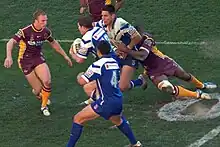 Head injuries in sports of any level (junior, amateur, professional) are the most dangerous kind of injuries that can occur in sport, and are becoming more common in Australian sport. Concussions are the most common side effect of a head injury and are defined as "temporary unconsciousness or confusion and other symptoms caused by a blow to the head." A concussion also falls under the category of Traumatic Brain Injury (TBI).[1] Especially in contact sports like Australian rules football and rugby, issues with concussions are prevalent, and methods to deal with, prevent and treat concussions are continuously being updated and researched to deal with the issue. Concussions pose a serious threat to the patients’ mental and physical health, as well as their playing career, and can result in lasting brain damage especially if left untreated. The signs that a player may have a concussion are: loss of consciousness or non-responsiveness, balance problems (unsteadiness on feet, poor co-ordination), a dazed, blank or vacant look and/or confusion and unawareness of their surroundings.[2] Of course the signs are relevant only after the player experiences a blow to the head.