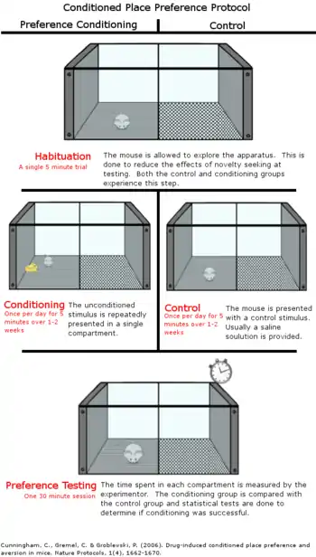 Conditioned place preference (CPP) is a form of Pavlovian conditioning used to measure the motivational effects of objects or experiences.[1] This motivation comes from the pleasurable aspect of the experience, so that the brain can be reminded of the context that surrounded the "encounter".[2] By measuring the amount of time an animal spends in an area that has been associated with a stimulus, researchers can infer the animal's liking for the stimulus.[3] This paradigm can also be used to measure conditioned place aversion with an identical procedure involving aversive stimuli instead. Both procedures usually involve mice or rats as subjects.[4][5] This procedure can be used to measure extinction and reinstatement of the conditioned stimulus. Certain drugs are used in this paradigm to measure their reinforcing properties. Two different methods are used to choose the compartments to be conditioned, and these are biased vs. unbiased. The biased method allows the animal to explore the apparatus, and the compartment they least prefer is the one that the drug is administered in and the one they most prefer is the one where the vehicle is injected.[6] This method allows the animal to choose the compartment they get the drug and vehicle in. In comparison, the unbiased method does not allow the animal to choose what compartment they get the drug and vehicle in and instead the researcher chooses the compartments.[6]