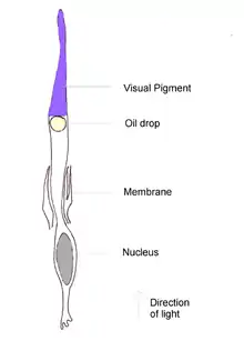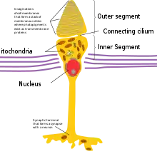 Like rods, each cone cell has a synaptic terminal, inner (nearer the brain) and outer segments, as well as an interior nucleus and various mitochondria. The synaptic terminal forms a synapse with a neuron bipolar cell. The inner and outer segments are connected by a cilium.[2] The inner segment contains organelles and the cell's nucleus, while the outer segment contains the light-absorbing materials.[2]