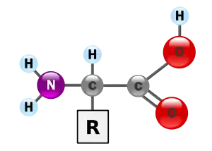 | The general structure of an α-amino acid, with the amino group on the left and the carboxyl group on the right. | |