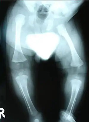 Congenital distal spinal muscular atrophy is a hereditary condition characterized by muscle wasting (atrophy), particularly of distal muscles in legs and hands, and by early-onset contractures (permanent shortening of a muscle or joint) of the hip, knee, and ankle. Affected individuals often have shorter lower limbs relative to the trunk and upper limbs. The condition is a result of a loss of anterior horn cells localized to lumbar and cervical regions of the spinal cord early in infancy, which in turn is caused by a mutation of the TRPV4 gene. The disorder is inherited in an autosomal dominant manner.[1] Arm muscle and function, as well as cardiac and respiratory functions are typically well preserved.[2]