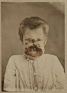 Congenital syphilis is syphilis that occurs when a mother with untreated syphilis passes the infection to her baby during pregnancy or at birth.[4] It may present in the unborn baby, newborn baby or later.[1][5] Clinical features vary and differ between early onset, that is presentation before age 2-years of age, and late onset, presentation after age 2-years.[4] Infection in the unborn baby may present as poor growth, non-immune hydrops leading to premature birth or loss of the baby, or no signs.[2][4] Affected newborns mostly initially have no clinical signs.[4] They may be small and irritable.[4] Characteristic features include a rash, fever, large liver and spleen, a runny and congested nose, and inflammation around bone or cartilage.[2][4] There may be jaundice, large glands, pneumonia, meningitis, warty bumps on genitals, deafness or blindness.[4][6] Untreated babies that survive the early phase may develop skeletal deformities including deformity of the nose, lower legs, forehead, collar bone, jaw, and cheek bone.[4] There may be a perforated or high arched palate, and recurrent joint disease.[2][4] Other late signs include linear perioral tears, intellectual disability, hydrocephalus, and juvenile general paresis.[4] Seizures and cranial nerve palsies may first occur in both early and late phases.[4] Eighth nerve palsy, interstitial keratitis and small notched teeth may appear individually or together; known as Hutchinson's triad.[4]