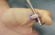 There are two types of surgery: open surgery which is mentioned above and percutaneous surgery. Unlike open surgery percutaneous surgery is done without exposing the anatomical structures beneath the skin. Research has shown that percutaneous surgery is a good alternative to open surgery. Percutaneous surgery is done with a needle that is inserted in the flexor sheath at the level of the A1 pulley. Before the needle insertion the thumb is placed in extension, whereas when the needle is already inserted the thumb will be put into semi-flexion, so that the needle can be moved and the palmar skin is movable. The A1 pulley will then be cut with the needle longitudinally and parallel to the fibers of the tendon of the flexor pollicis longus muscle. When the release with the needle is done according to the pivot maneuver the chances of incomplete release and damage to the digital nerve nearby will be increased. To prevent any postoperative hematoma and swelling, pressure should be applied for at least 10 minutes after the procedure. Percutaneous surgery has also been proven to be without residual deformities and recurrence after surgery. When the A1 pulley is too thick and long to be released at once, open surgery still can be a solution. The advantages over open surgery are that percutaneous surgery is simpler, more straightforward and shorter concerning the duration. It can also be done in every other examination room unlike the open surgery, which is done in an operation room. The risk nonetheless is that the digital nerve of the thumb nearby can be damaged.[11]