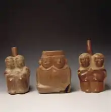 The Moche culture of ancient Peru depicted conjoined twins in their ceramics dating back to 300 CE.[36] Writing around 415 AD, St. Augustine of Hippo, in his book, City of God, refers to a man "double in his upper, but single in his lower half—having two heads, two chests, four hands, but one body and two feet like an ordinary man."[37]