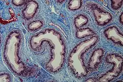 ![]() Section of epididymis. Connective tissue (blue) is seen supporting the epithelium (purple) | |